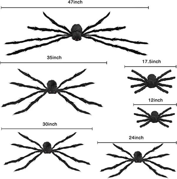 • Halloween Large Prop Set comes with 8 black hairy spiders of different sizes (47”, 35”, 30”, 24”,17.5”,17.5”, 12”, 12”). Perfect Halloween decoration for your home, office, Halloween parties, haunted houses & yard.