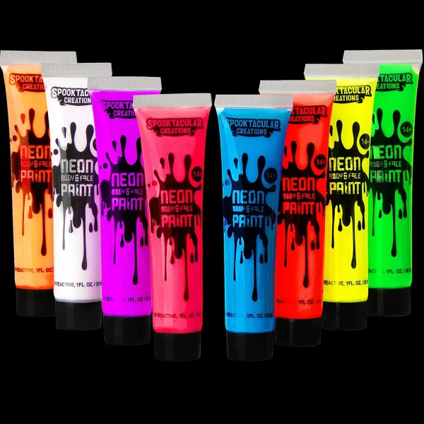 • Neon Halloween Face Paint contains 8 bright neon dayglow colors: White, Red, Orange, Yellow, Green, Blue, Pink, and Purple.