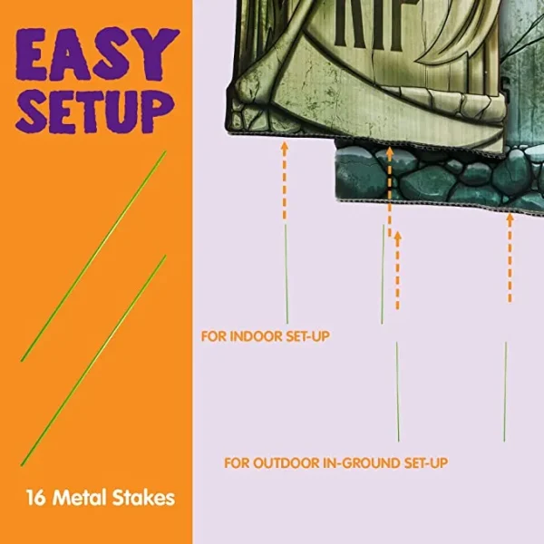 • Includes 8 different spooky headstones designed (RIP, death, demon, vampire, skeleton) PVC tombstone + 16 metal stakes (each tombstone requires 2 stakes)