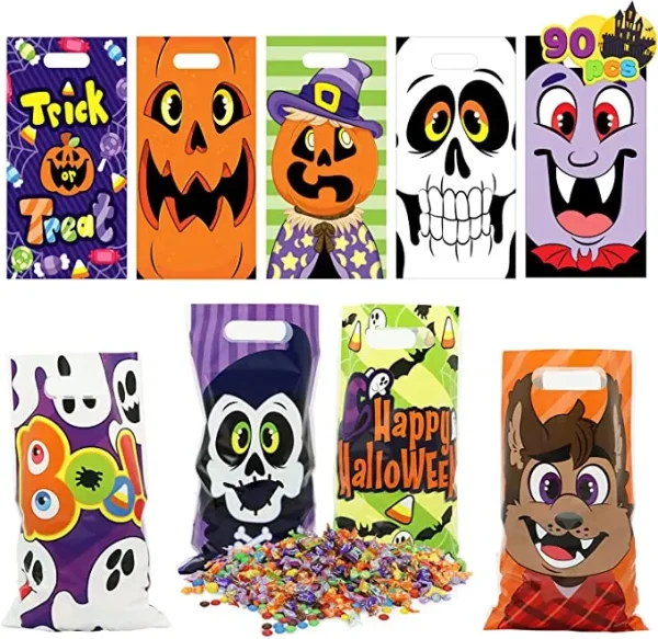 • Treat Bags Halloween include 90 pcs of square 6×11 inch goodie bags in 9 different halloween themed character designs for trick or treat Give Away Party Favor Gift Bags