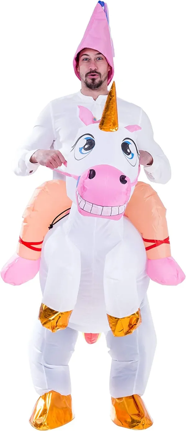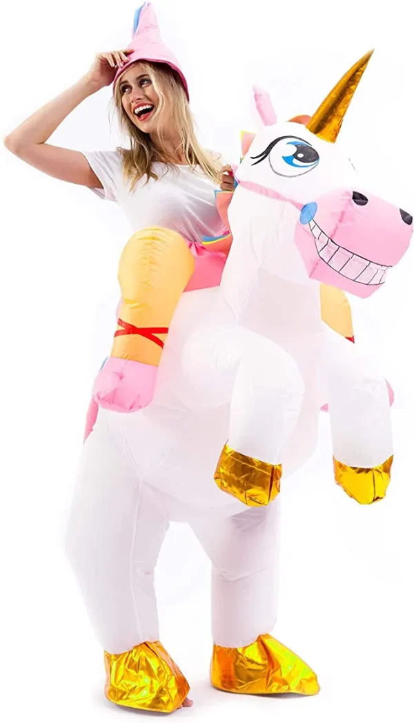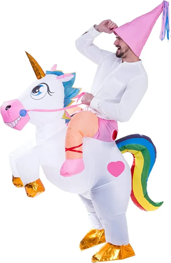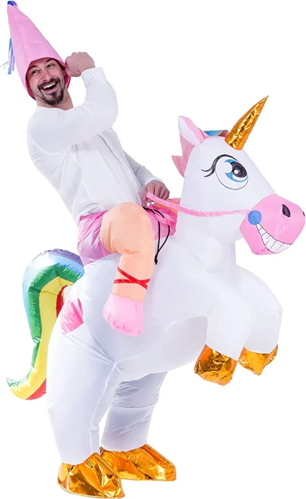 This adorable riding unicorn Halloween costume features a pair of drawstring pants that inflate easily, thanks to a built air pump and battery pack. Golden shoe covers match the unicorn’s front hooves and a little cone hat completes the look. It says volumes about your contagious personality when paired with your favorite top for an outrageous but oh-so-fun style. In this costume, you almost seem too good to be true. See what’s more in our inflatable halloween costumes today!Â