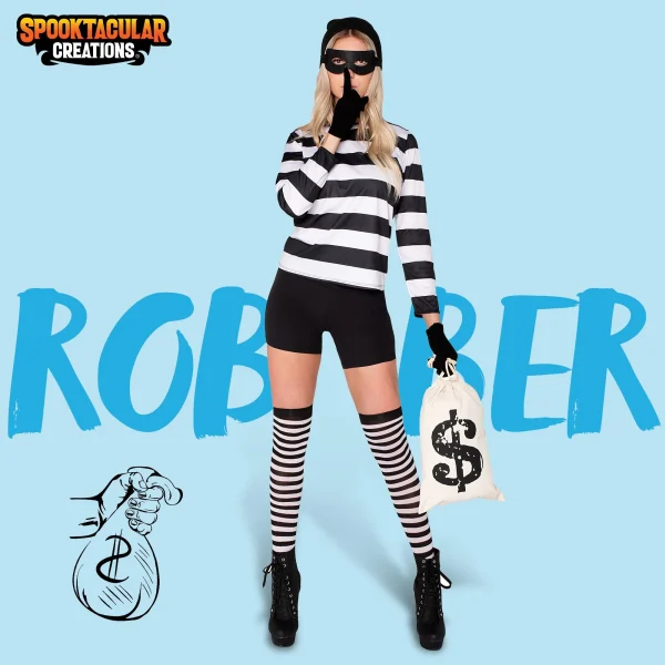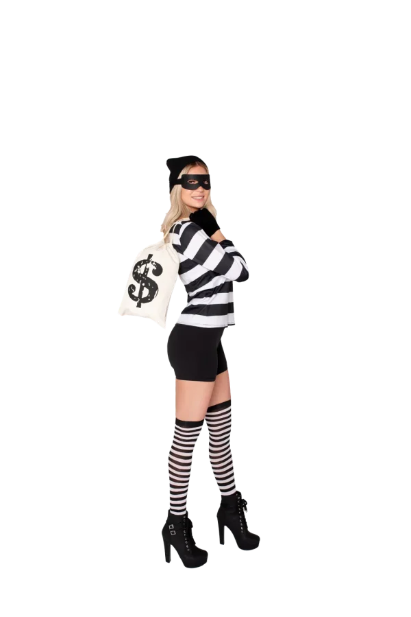 - SUPER VALUE PACK. Our adult women burglar costume will make you an eye-catching one in the party. This robber costume for women includes one long sleeve striped T-shirt, one pair of black gloves, one black knitted hat, one dollar sign money bag, one black eye patch, and one pair of knee-long socks. This Halloween burglar costume will be one of the Halloween costumes everyone will be talking about at the Halloween party!