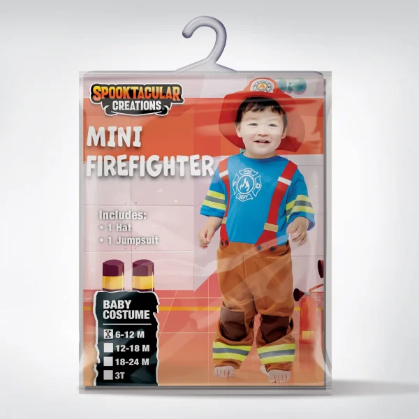 - SUPER VALUE PACK. Our firemen costume for kids is suitable for children to make fun, crazy, and unique Halloween role-playing games. Presenting the Spooktacular Mini Firefighter Costume Deluxe Set for Infant. Includes a Red Fire Hat and a Blue and Khaki Firefighter Jumpsuit.