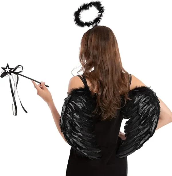 • Black Angel Wings Halloween Costume includes 1 feather Angel wings, 1 Halo headband, and 1-star wand. These feather wings are easy to wear with elastic straps.