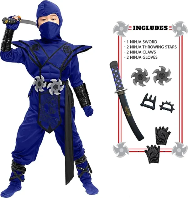 - SPOOK IN STYLE. Our Blue Ninja Boys Costume Includes a Jumpsuit with Attached Hood, Face Mask, Belt, a Pair of Gloves, a Pair of Arm Covers, and other foam accessories.