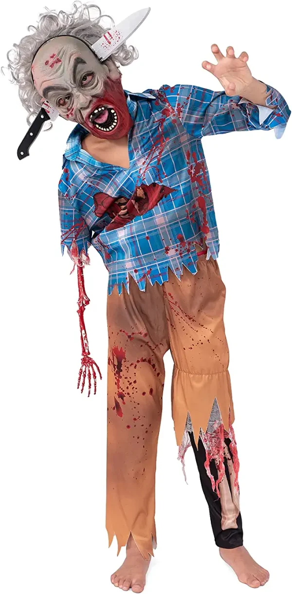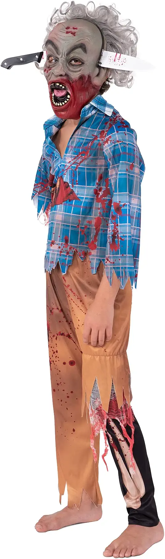 - PREMIUM QUALITY. This Haunted Zombie Costume is Super Durable. The material is made out of 100% Polyester. Contains a Bloody Creepy Mask with White hair and a Fake Stabbed through knife Headband, a Blue Ragged Bloody Plaid Shirt with a brand new design of a Bloody Skeleton Arm attached, and a pair of Ragged pants with Blood and Skeleton designs that put this costume to another level. Get your kid this Wounded Zombie Costume Deluxe Set and Spook it out this Halloween!