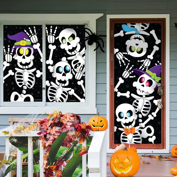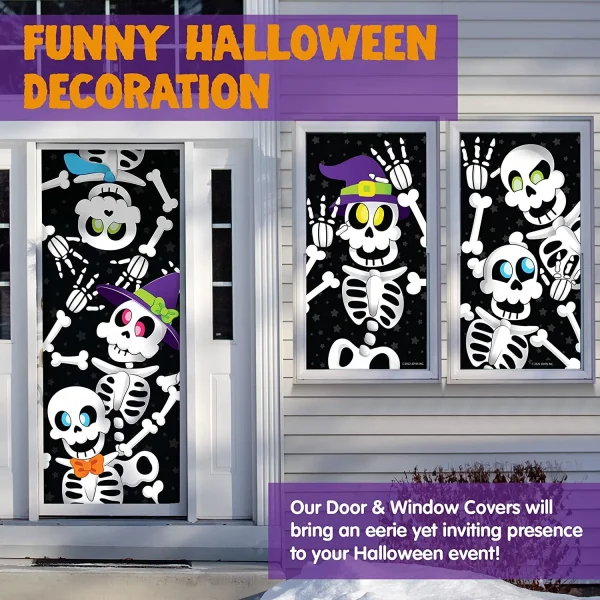 - AWESOME HALLOWEEN DECOR. Our door cover Halloween decorations includes 1 piece Skeleton Door Cover ( 30” x 72” )with 3D design, 2 pcs Skeleton window(30” x 60”)covers which adds spookiness to your entry door decorations.