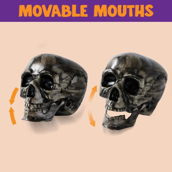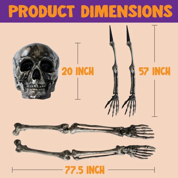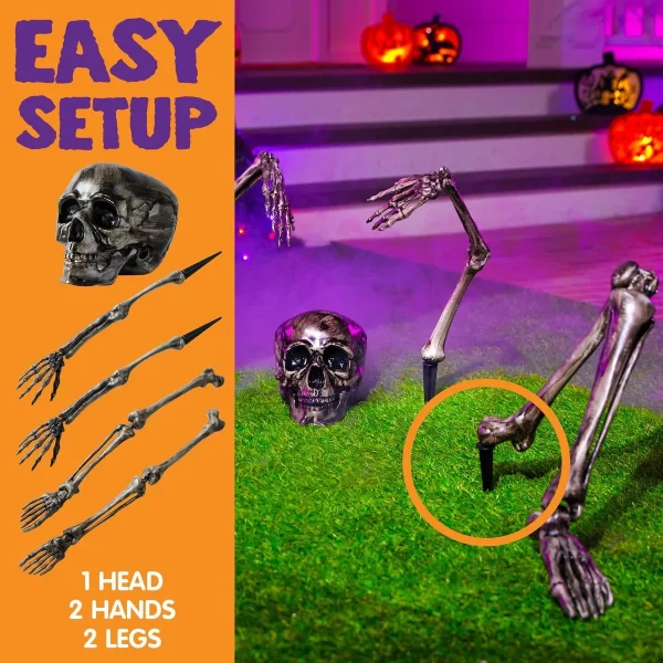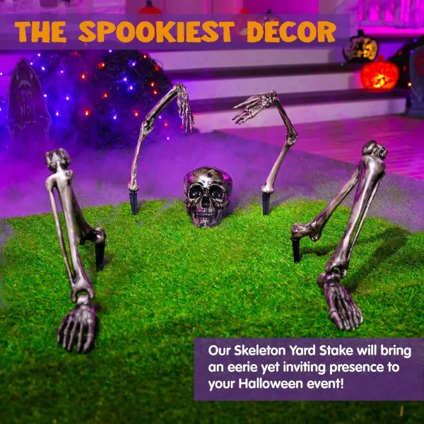 - SUPER VALUE PACK. Our groundbreaker skeleton décor includes 1 pack of skeleton ground stakes, a realistic skull, and skeleton arms. The Halloween lawn skeleton skull is designed with hollow black eyes and nose, with clear black crack pattern detail on head and face, give it a scary and realistic look and make it look creepy and terrifying.
