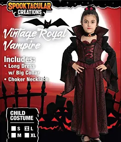 • Girl Vampire Halloween Costumes Include a long dress with a Printed maroon pattern/ a big collar and a choker. Ribbon laced decorative corset on the bodice