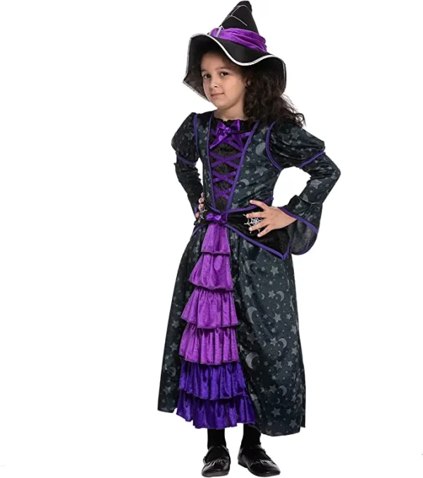 • Witch Costume for Girls includes a witch’s matching hat and a long purple and black dress with stars and moon patterns.