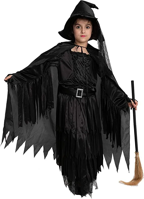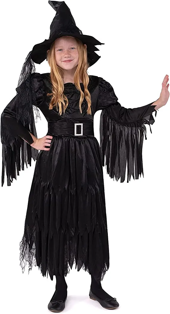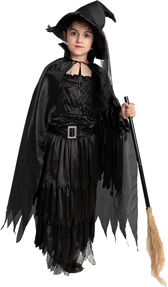 • Girls Witch Halloween Costume Includes Witch’s Hat, Long Sleeved Dress, and Cape