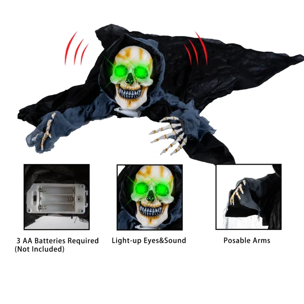 • Groundbreaking Skeleton is equipped with a motion sensor that will activate its creepy sound and will flash scary lights in its eyes. It measures 59 inches, Funny Halloween decoration, Halloween prop for your home yard, graveyard scenes, or Halloween party!