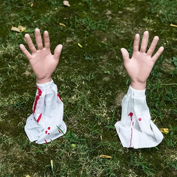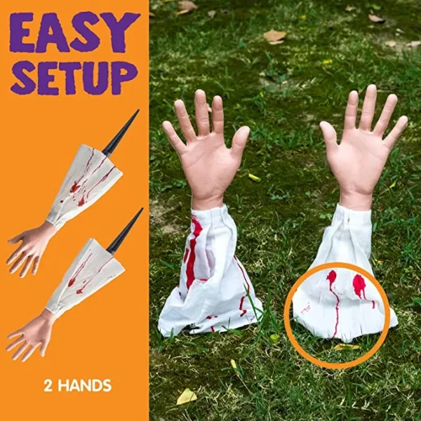 • Halloween Yard Decor includes one Pair of Zombie Hands with Lawn Stakes Covered by Bloody Sleeves