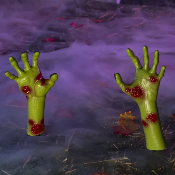 These spine-chilling zombie hands Halloween decorations are exactly what you need to make your house the scariest on the block. This fantastic, movie-quality prop comes with a realistic-looking zombie hand. These spooky necrotic hands are made of very durable plastic and are designed to last for years. They come with realistic-looking zombie hands that are painted with a decaying green color to give them a gruesome appearance, which makes them perfect for placing anywhere in your yard or around your home. You can place them on the ground or scatter them around as if they were coming out of the earth. The pair also looks great when placed on top of tombstones or gravestones, giving them a truly terrifying appearance! You can even use these hands to decorate for Halloween next year!