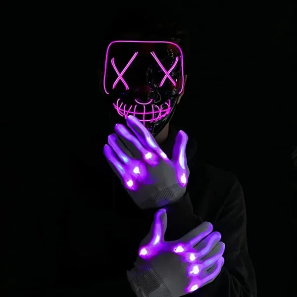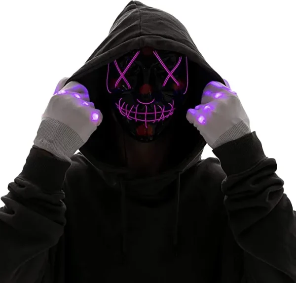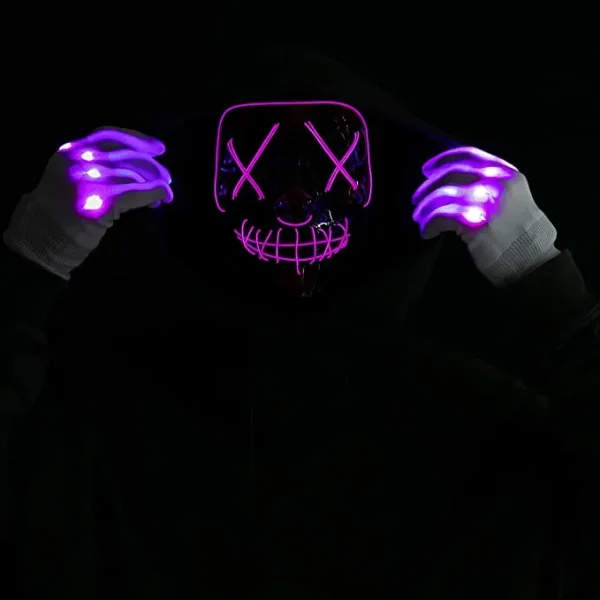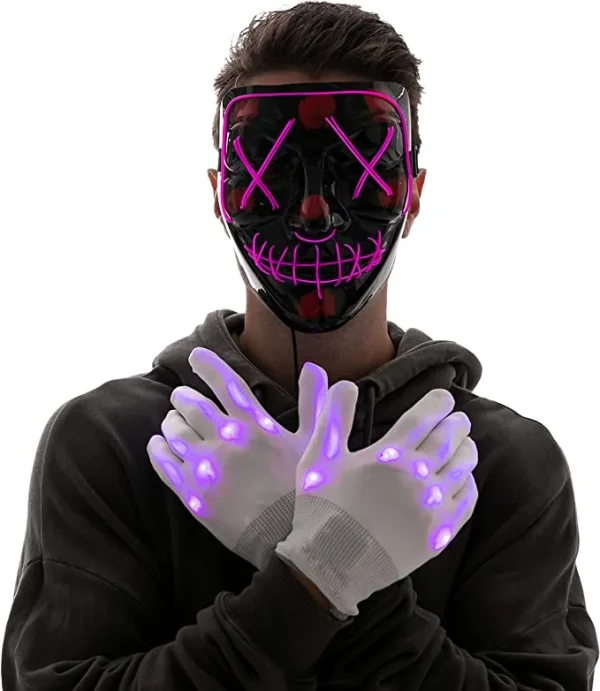 • LED Face Halloween Mask includes 1 Halloween Themed LED face Mask and a pair of gloves in purple color, making your Halloween party glow in the dark.