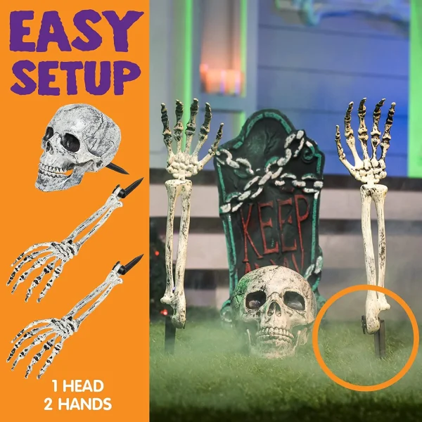 • Graveyard Halloween Decorations include One 17″ Lightweight Foam Graveyard Headstones with 2 Metal Stakes, One Skeleton Skull, and a pair of Skeleton Hand