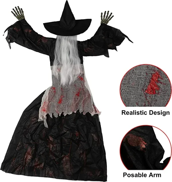 • Halloween Witch Decoration features clothes with blood on it and white hair. It measures 38.6 inches with posable arms.