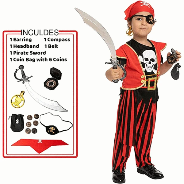 • Our Pirate Halloween Costumes come with a Vest, Belt. Pirate Hat, Pants, a pair of shoes, compass, pirate sword, earrings, and 1 coin bag with 6 coins. Everything is included in your little pirate’s costume!