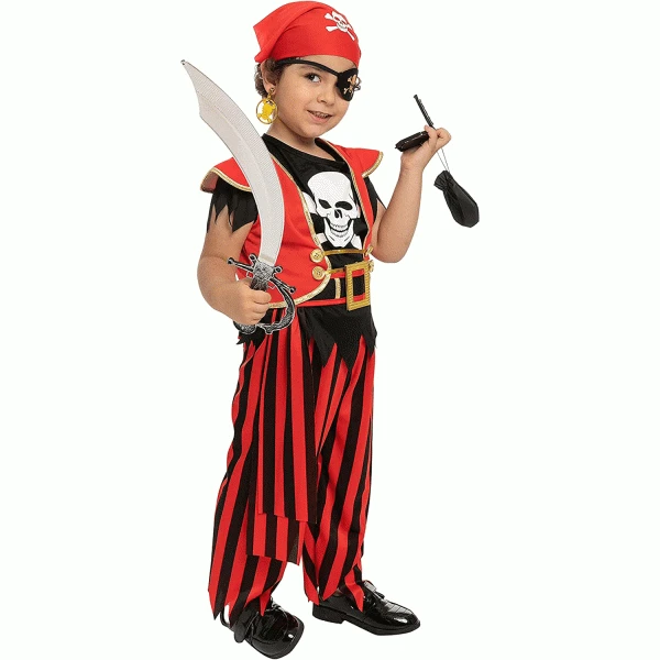 Pirate costume with Black and red costume top printed with white skull and cross bones is super durable. Made with Superior Quality 100% Polyester. Super Value Pack for Role Play. Perfect for Halloween Dress Up Parties, Theme Party Costumes, Best Halloween Costume, Halloween Dress Up Party, Baby Monster Themed Party, Pirate Themed Party, and More. Hand Wash Cold. Line Dry. Do Not Bleach. Safety Test Approved. Easy to Wear, Unique Halloween Costume for Kids Pirates of the Caribbean Themed Party. Instaworthy Halloween Costume Contest Idea! Add Lots of Fun to Your Halloween Party and Other Theme Activities!