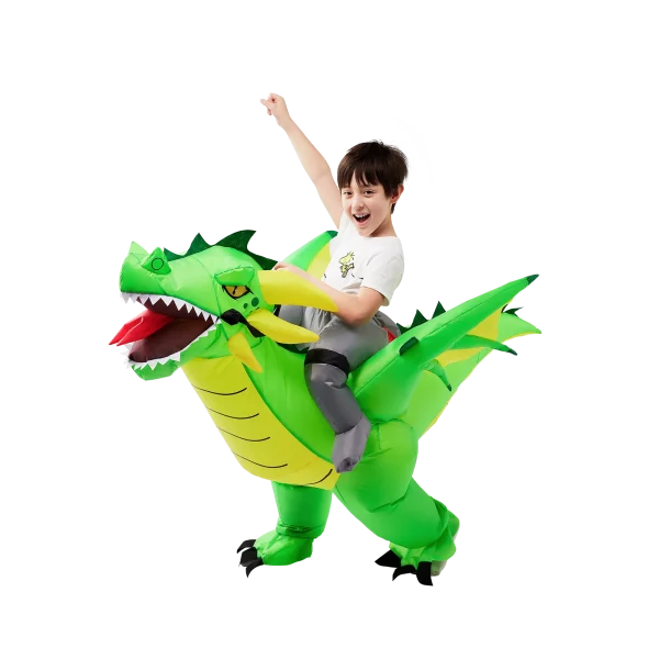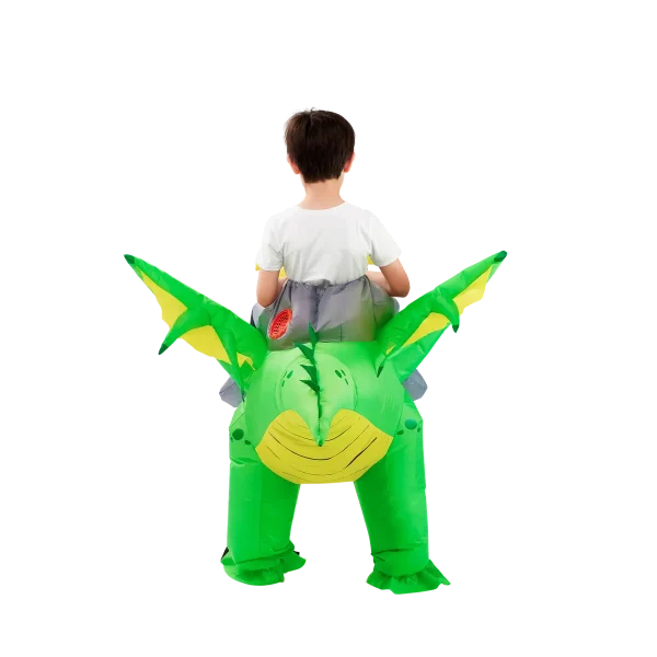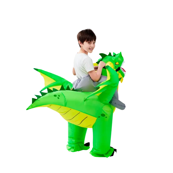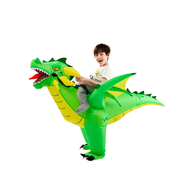 - PREMIUM QUALITY: Our kids inflatable dragon costume are Super Durable and made with Superior Quality. The material is made out of 100% Polyester. Quick and Easy to inflate and deflate with a High Powered Air Pump. The extended wings make this costume looks more vivid, allowing children to get more into the character! Get this Distinctive Green Cool Dragon Inflatable Costume and have a blast!
