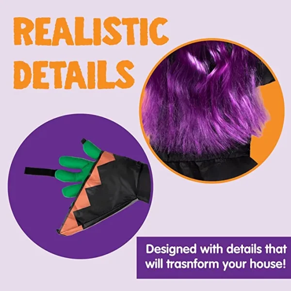 • Featuring bright purple hair, green hands, and a colorful stocking, this prop looks vivid. The dropping broom and open arms and legs show that she has been crushed into the tree, which makes the whole scene looks funny