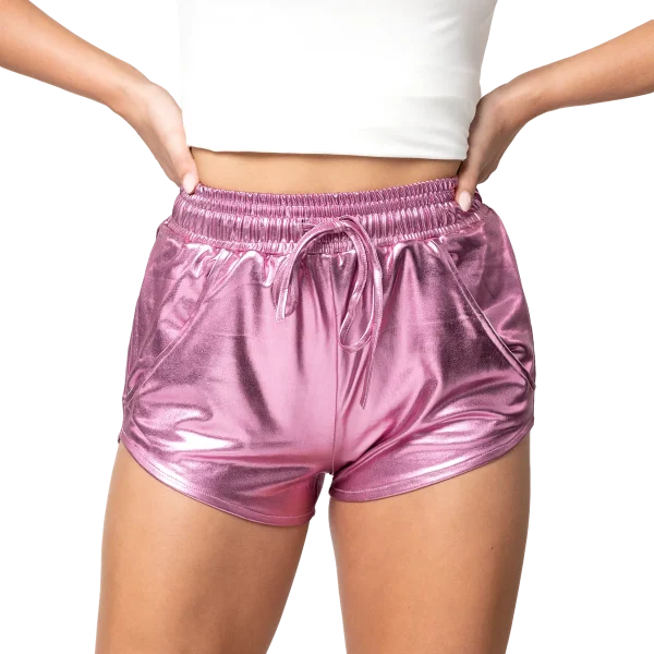 - SIZE. Our pink shiny shorts are on standard size that fits most women. Waist: 21.25”-37”, Length:14.17”, Leg: 22”, Hip: 34.65”.