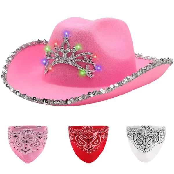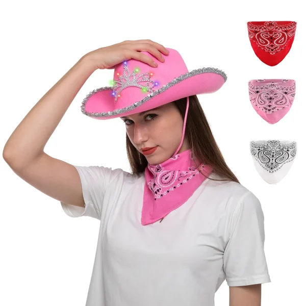 • Womens Pink Cowboy Hat includes 1 pink cowboy hat with light-up crown tiara, 1 red bandana, 1 pink bandana, and 1 white bandana. 3 LR44, AG13 Alkaline Battery are needed for use.